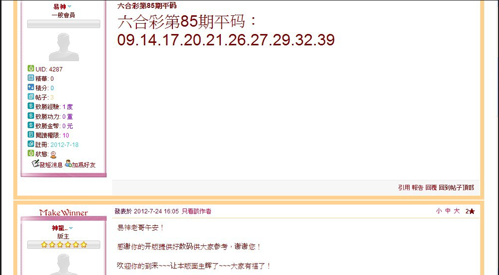 哗!朋友!我昨天刚刚在致胜试发第一次就给你跟到了,你运气真好!哈哈哈!虽然平码不中,但我还是赢钱,有跟我牌的,你知道有多少人吗?你这样的做法有用吗?何况我在这乐透堂也有发表过,你这样做有意义吗?你只会告诉大家你是一个嫉妒心极强的人。。。