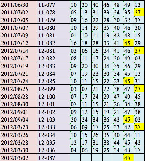 依大我有一組牌月初使用三期,小則二星大則三星:以上個月最後一期第一支和本月前三期合數(18.19)。(39.49)。(14.24.34)分別採三柱,最少二星,重點這三組一定開。本次04合(14.15)=18.19。 04合(35.45)=39.49。 04合(10.20.30)=14.24.34。參考.有合到依大的(35.45)所以本月第一期應該會會中。