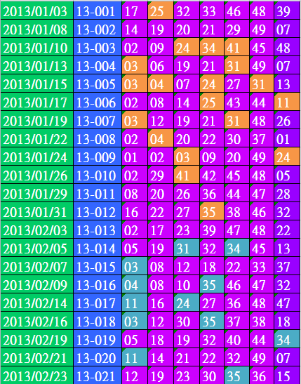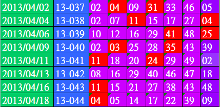(3)把第一,二組號碼加總平均,分配進回七區,後求出累計平均數結果求出類似得奬號碼:8,18,25,41,39,45