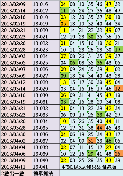 比對君的選號中,和我的有些類同,如03,04,11,25,41,等,另有些我已放棄的如31,41,只因尾數不合理想,及拖牌也沒有支持點,故甘放棄矣!和君的選擇類同是一種好先兆頭啊!謝,謝,君的回應,加添了我的不少力量!多謝支持!!!
